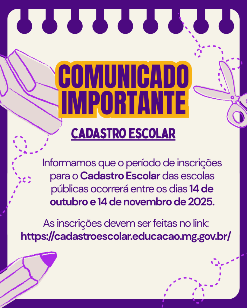 ATENÇÃO, FAMÍLIAS! O período de Cadastro Escolar 2025 para as escolas públicas já tem data marcada!  As inscrições acontecem de 14 de outubro a 14 de novembro de 2025.Acesse o link para garantir a vaga do seu filho(a):https://cadastroescolar.educacao.mg.gov.br/ Não deixe para a última hora! ⏳